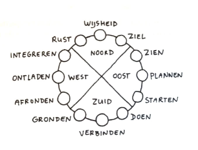 Binnen veel sjamanistische culturen spelen de vier richtingen (noord, oost, zuid, west) een belangrijke rol. Ze zijn gekoppeld aan o.a. dagdelen, de seizoenen en de fasen van de maan en laten ons allereerst de basisritmes van de natuur zien. Als je met de vier richtingen kennismaakt, wordt al snel duidelijk dat er een grote diepte in schuilt. Op de vier richtingen vindt elke mogelijke menselijke ervaring een plek. Op hun eigen plaats in de cirkel (het wiel, zoals het genoemd wordt), vormen ze een landkaart die ons helpt om onze weg te vinden op emotioneel, psychologisch- en spiritueel niveau. Het leert ons te begrijpen hoe onze binnenwereld functioneert en laat ons zien hoe we die kunnen reguleren. Het geeft ons ook een heldere kijk op de wereld om ons heen, waarin we onze plek moeten vinden.