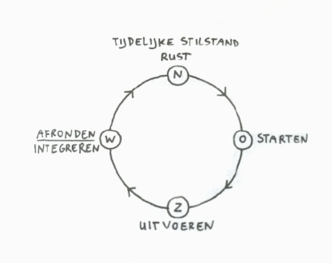De vier richtingen staan ieder voor een eigen dynamiek. Vergelijk het met de loop van de zon in een etmaal: